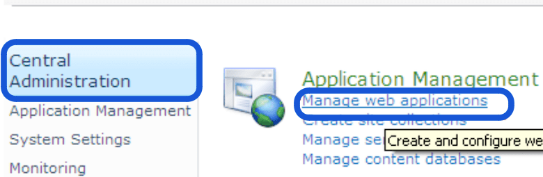 Vá até a Central Administration e, em Manage web applicarions, vide abaixo.
