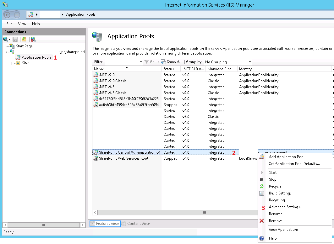 Parte 2 – O caso anterior por ser tratar de um ambiente produtivo eu já tinha descartado a primeira possibilidade, mas para minha surpresa foi product key, digo isso porque esse problema ocorre normalmente por o pool de aplicação da CA esta sendo executado por um usuário Network Credentials, esse pool precisa ser executado por um usuário que seja administrador local e esteja no AD, ou seja um usuário que esteja no grupo de administradores local. para verificarmos se esta se este requisito esta sendo atendido vamos até o IIS.
