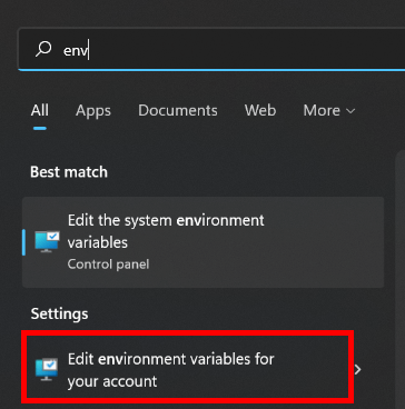 Abra o menu Iniciar do Windows e digite “env”, em seguida, selecione a opção que diz “Editar variáveis de ambiente para sua conta”: