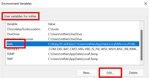 Em “Variáveis do usuário”, encontre a variável “Path”, selecione-a e clique em “Editar…”: