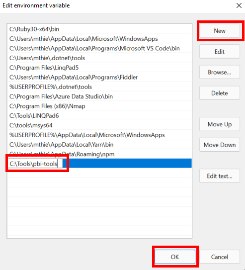 Clique em “Novo”. Em seguida, digite C:\Tools\pbi-tools e confirme com “OK”.