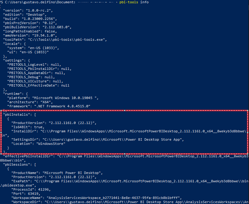 Retorna um JSON, confirmando a versão da ferramenta, a localização da ferramenta e quaisquer instalações do Power BI Desktop que ele conseguiu detectar.