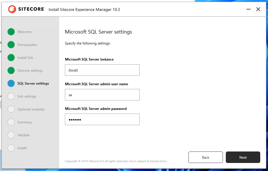 - Microsoft SQL Server Admin Password: The password you set to user ‘sa’.